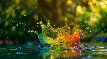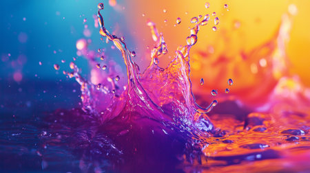 A stunning close-up image capturing a colorful water splash with vibrant hues. The light reflects off the droplets, creating an enchanting visual for artistic projects.
