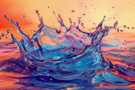 This captivating image features a vibrant water splash with dynamic motion, reflecting warm sunset hues and showcasing an abstract interplay of colors and fluid dynamics.