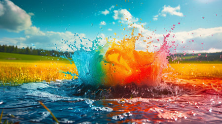 colorful splash of water in an open field, with clear skies and nature around. generative ai