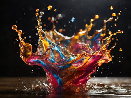 Stunning abstract image showcasing colorful liquid splashes and droplets with dynamic swirls, perfect for artistic projects and creative designs.