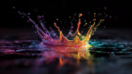 Water droplets burst into colorful splashes against a dark backdrop, creating a mesmerizing display of light and movement, evoking energy and dynamism.