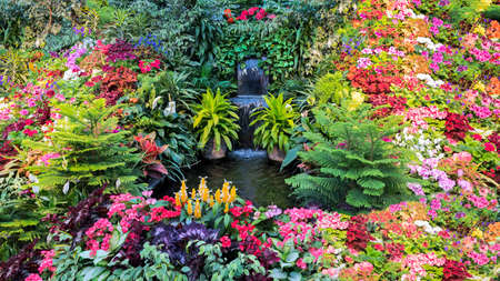 Beautiful flower garden in the park with sunlight and shadow on the ground