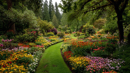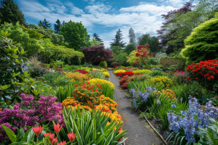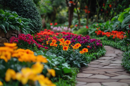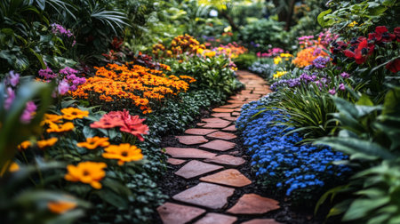 Lush garden pathway surrounded by vibrant colorful flowers on a tranquil summer day