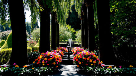 Vibrant garden filled with colorful flowers, lush greenery, and central fountain creates serene atmosphere. Benches are placed along pathways, inviting visitors to relax and enjoy nature beauty