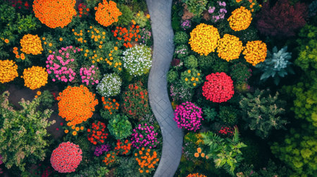 Aerial view of beautiful ornamental garden with colorful flowers and path