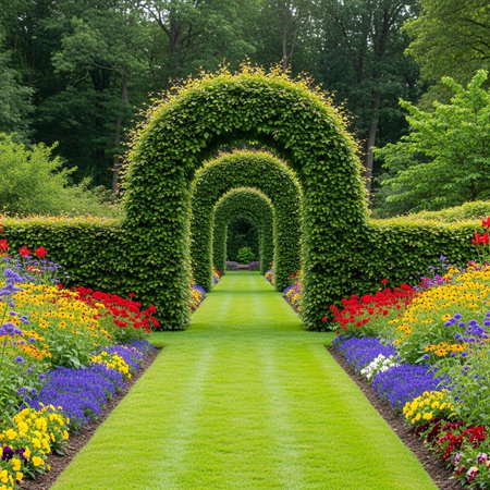 Scenic garden path with colorful flowers blooming on each side, creating a vibrant and peaceful atmosphere