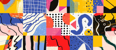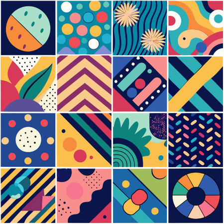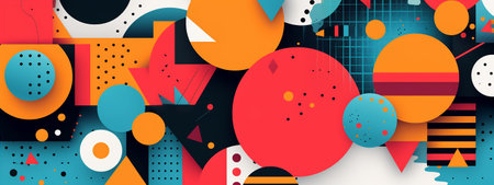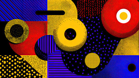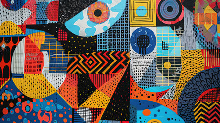 Vibrant and playful abstract pattern featuring a variety of geometric shapes and textures in a bold color palette.