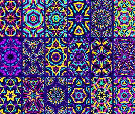 Kaleidoscopic Patterns Set. Abstract kaleidoscope flower patterns. Kaleidoscope backgrounds. Bright tile patterns set. Indigo colorful backgrounds. Seamless patterns. Geometric patterns