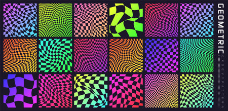 Groovy checkered pattern, colorful distorted tiled grid. Vintage wavy curved backdrop, distortion effect. Funky geometric chessboard texture, retro background in 90s style, y2k. Vector illustration