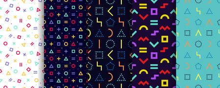 Set of five geometric textures. Memphis seamless pattern. Vector. Minimal abstract cover. Wrapping paper design. Colorful geometric background. Pattern templates in swatches panel