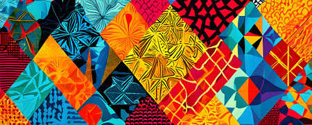 Bright geometric tessellations with vivid colors and repeating shapes create a dynamic texture