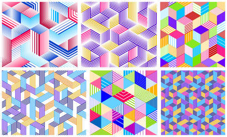 Seamless cubes vector backgrounds set, lined boxes repeating tile patterns, 3D architecture and construction, geometric designs.