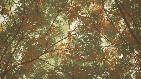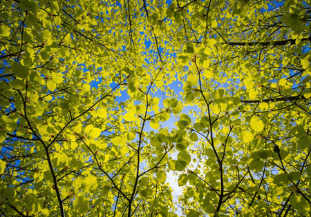 A stunning view of sunlight filtering through a vibrant canopy of green and yellow leaves with intricate branches creating a peaceful and serene forest atmosphere.