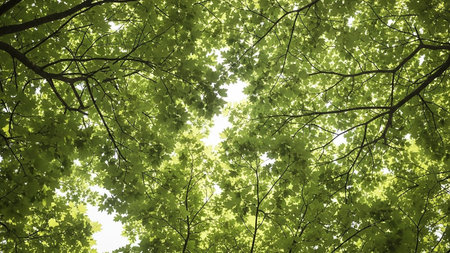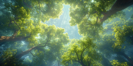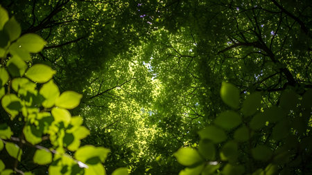 A low-angle view looking up into a lush forest canopy, where vibrant green leaves filter the bright sunlight. The towering tree branches create a natural roof against glimpses of a blue sky, symbolizing growth and fresh air.