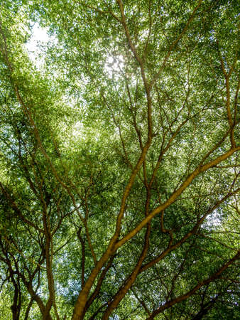 A dense canopy of vibrant green leaves fills the frame, with sunlight filtering through the branches, creating a dappled effect. The image is taken from a low angle, looking upwards, emphasizing the height and density of the foliage.