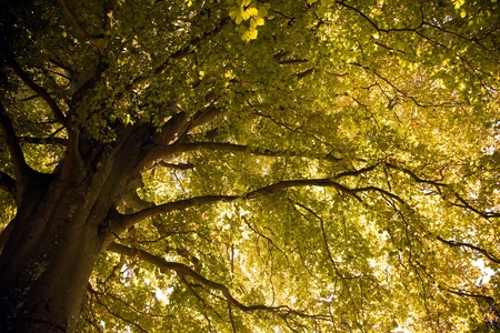 From below, the view upwards reveals strong branches and dense foliage of a healthy tree. The green leaves create a beautiful, textured ceiling of nature.