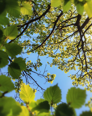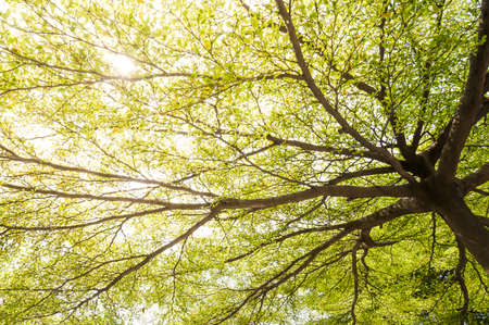 The view from below of a tree canopy, with sunlight filtering through the vivid green leaves, offers a perspective of tranquility and growth.