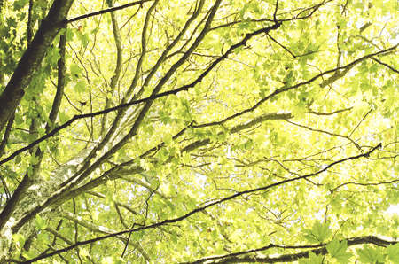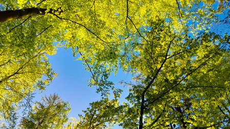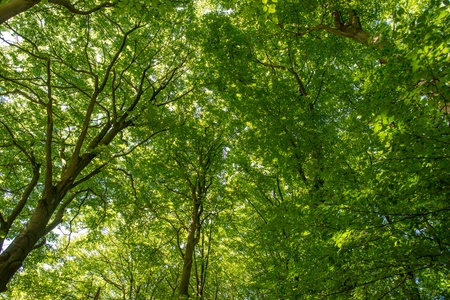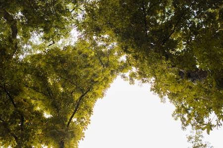 forest trees view from below into the sky. nature green wood sunlight backgrounds