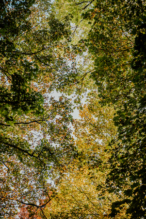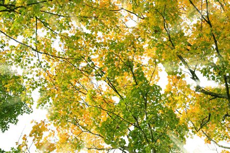 Yellow autumn leaves, oak tree foliage, with warm fall colors on bright sunny day on blue sky. Idyllic natural background.