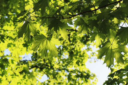Young Light Green Tree Leaves Illuminated by the Sun. Beautiful Sunshine Natural Spring Texture Background