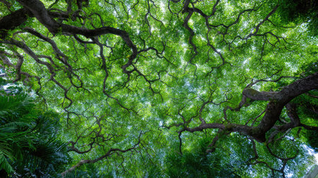 A view looking directly up through a dense canopy of vibrant green leaves and intricate branches, with bright sunlight filtering through, creating a dappled light effect against the...