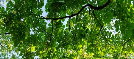 Panorama of green branches with chestnut leaves in summer against a blue sky