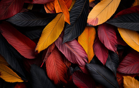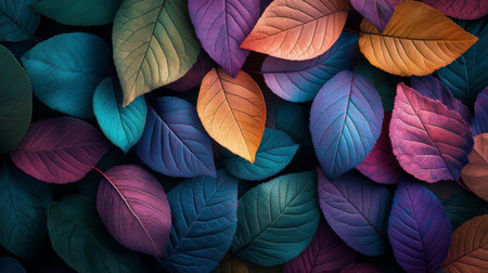 Discover a stunning array of multicolored leaves showcasing intricate patterns and textures against a dark backdrop. Perfect for nature-inspired designs.