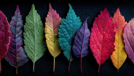An assortment of colorful leaves are arranged in a row, showcasing a spectrum of shades including purple, green, yellow, and red. The leaves' intricate textures and veins are highlighted, with the composition set against a dark background. This image could be utilized for various design applications, from decorative purposes to editorial illustrations.