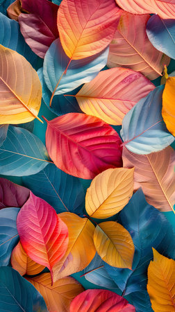 A stunning close-up of multicolored leaves showcasing vivid hues and intricate vein patterns. This image captures the beauty of natures palette, perfect for various themes.
