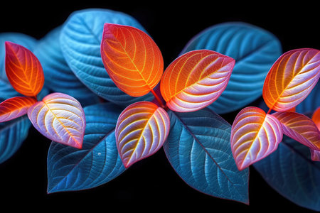 Vibrant Blue and Orange Leaves on a Black Background
