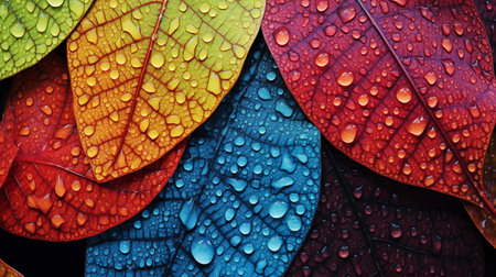 Colorful leaf background image with prominent water droplets. photos of the surface