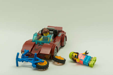 Florianopolis - Brazil, February 2, 2020: minifigure of cyclist getting hit by sportive car. traffic accident with injured biker on the ground. Minifigures are manufactured by The Lego Group.