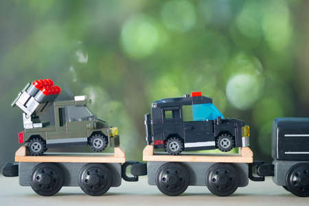 Miniature toy train carrying miniature toy military equipment vehicles weapons