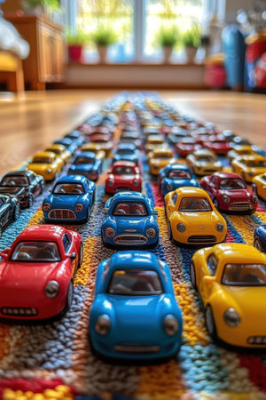 A vibrant display of toy cars in various colors, including red, blue, and yellow, is neatly arranged on a colorful rug. Sunlight illuminates the cozy living room, enhancing the cheerful atmosphere of this playful setup.