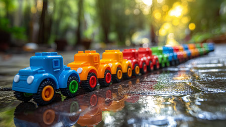 Brightly colored vintage toy cars neatly lined up, highlighting various classic designs and styles under warm lighting.