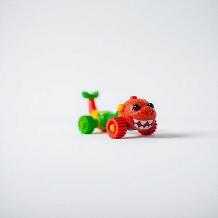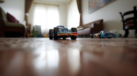 A red toy car placed on a wooden table, with colorful blocks in the background, creating a playful scene