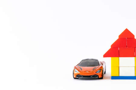 A beautiful orange toy car parked near small house showing wealth and property concept