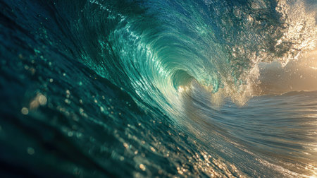 Close-up of a powerful ocean wave cresting and breaking at sunset or sunrise. Golden light illuminates the water's movement and intricate patterns, showcasing nature's beauty and dynamic energy.