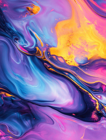 Abstract fluid art featuring vibrant purple, orange, and blue colors on a black background, showcasing mesmerizing patterns and textures in an artistic composition