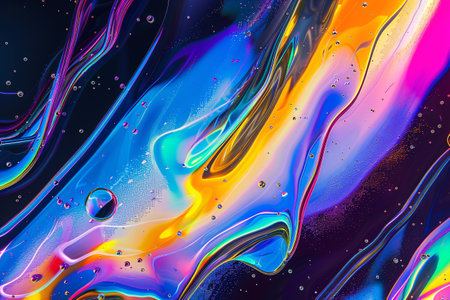 A background with vibrant colors and holographic texture displays a flowing liquid splash in various hues