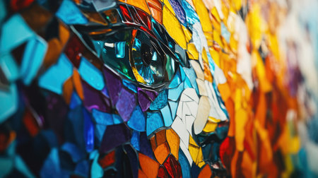This striking close-up showcases a colorful mosaic artwork, depicting a vivid animal's eye crafted from intricate glass tiles, highlighting its stunning artistry and vibrant hues.