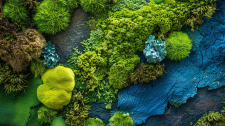 Lush Green Moss with Blue Algae on Rock Surface. Nature's Abstract Artwork