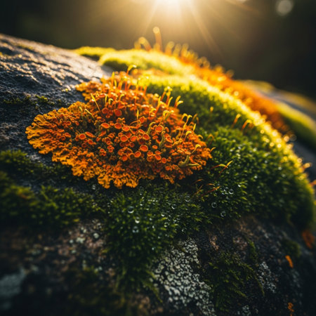 Close-up shot of vibrant green moss covering a weathered stone surface, bathed in warm golden sunlight.