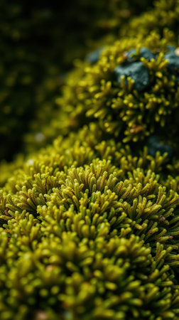 A vivid close-up of lush green moss thriving on a rock, showcasing intricate textures and vibrant colors, set against a serene forest background, perfect for nature enthusiasts.