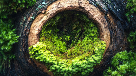 This close-up image showcases vibrant green moss nestled within a hollowed tree trunk, emphasizing the beauty of nature's textures and colors in a serene woodland setting.