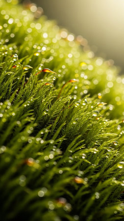 Detailed macro view of vibrant green moss covered in small, glistening water droplets.