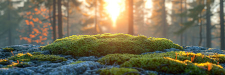Moss blankets the ground in a serene forest setting, capturing sunlight that breaks through the canopy. The vibrant greens create a peaceful and natural environment, inviting exploration.