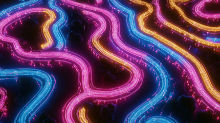 This digital artwork showcases a dynamic blend of neon colors and electric lighting, creating a futuristic and energetic mood. Perfect for enhancing nightlife and entertainment promotions, event posters, and digital media. The abstract style appeals to modern designers and marketers in the entertainment industry. AI-generated digital illustration. AI-generated illustration.