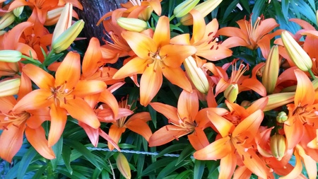 Close-up view of vibrant orange lilies amongst lush foliage. The image focuses on the intricate details of the flowers and the rich tones of the surrounding leaves and buds.