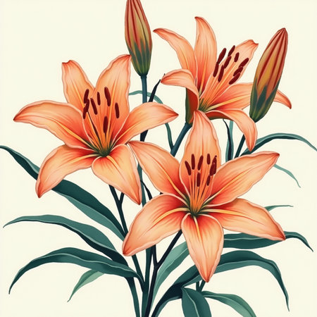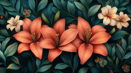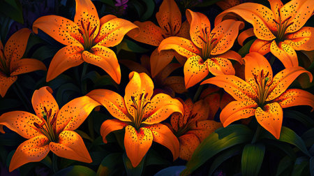 Design a detailed botanical drawing of a cluster of vibrant orange tiger lilies, emphasizing their speckled petals --chaos 30 --ar 16:9 --v 6.1 Job ID: d3d8a204-731e-4657-a38e-1d1a4c3c3c7c